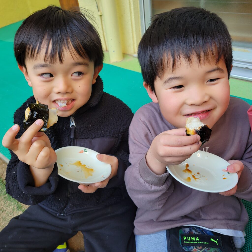 年長さんは、つきたてを食べ、丸めて次の日に七輪で焼いて味わうことをしました。